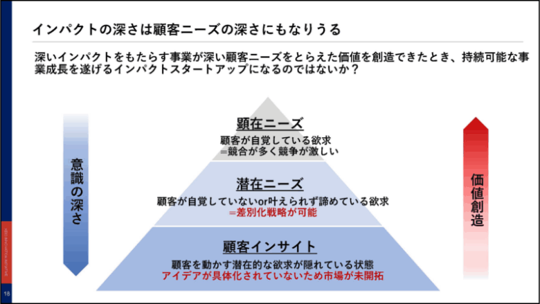 ではあらためて、インパクトの深さとは何か。顧客の深いニーズを捉えて新たな価値を創造する事業だからこそ、競争の少ない未開拓市場へとアクセスでき、持続可能な成長を遂げるインパクト・スタートアップに進化していけるのではないか。その上でも、研究開発型のディープテック・スタートアップには価値を創造していく上で大きな強みがあると考えられます。