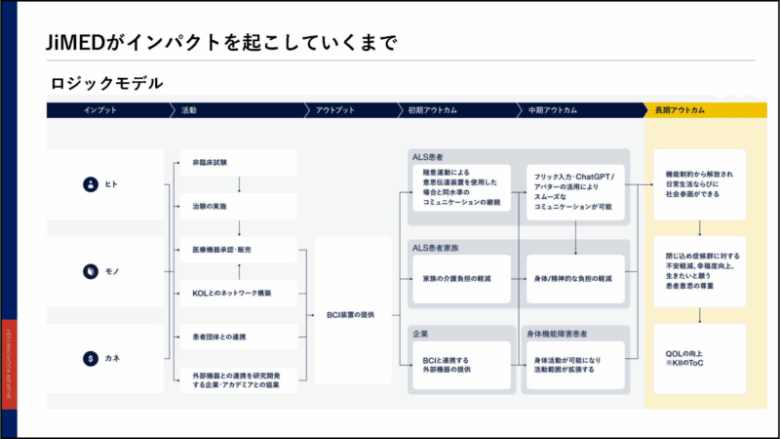 投影資料より、JiMEDがインパクトを起こしていくまでのプロセスを表現したロジックモデル。(提供:KII)
