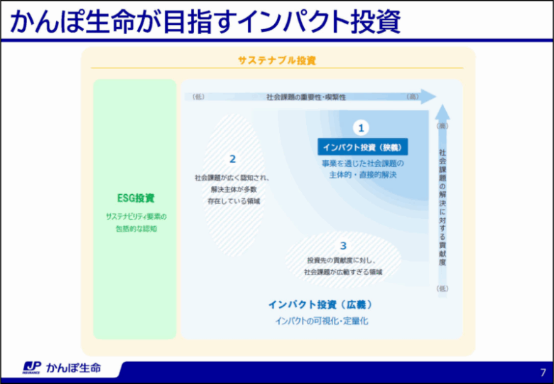投影資料より、かんぽ生命が目指すインパクト投資領域を図式化したもの。(提供:かんぽ生命保険)